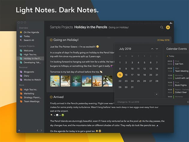 The notes in Agenda are beautifully styled and include powerful features like images, tables, file attachments, tags, lists, and links. You can even connect your notes to events in your calendar, and add due reminders to your tasks. Locating your notes also couldn’t be easier, with a powerful search, a project jump bar, and related notes list. And when you find what you’re looking for, simply click back in the history to where you were.