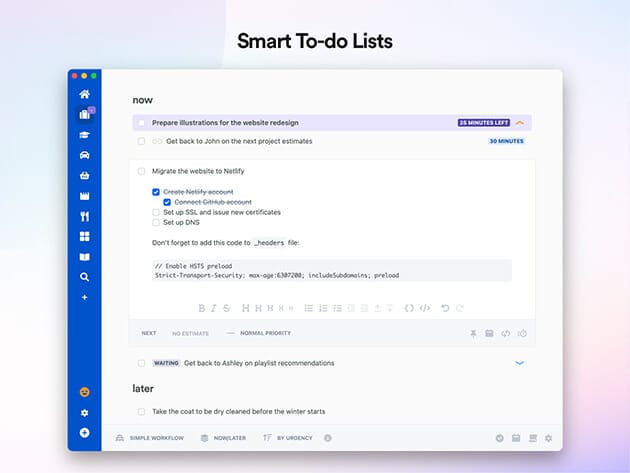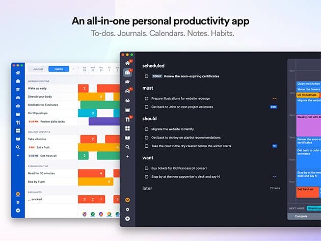 Lunatask is an all-in-one privacy-focused to-do list, notebook, habit and mood tracker, daily journal, and Pomodoro timer. It remembers stuff for you and knows what to work on next. Choose from a variety of production techniques to get stuff actually done.