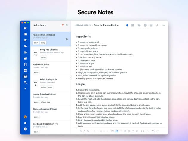 Secure Notes. Whether writing a list of goals for the next week, meeting notes or an entry into your daily journal, our encrypted notes and notebooks keep everything organized.