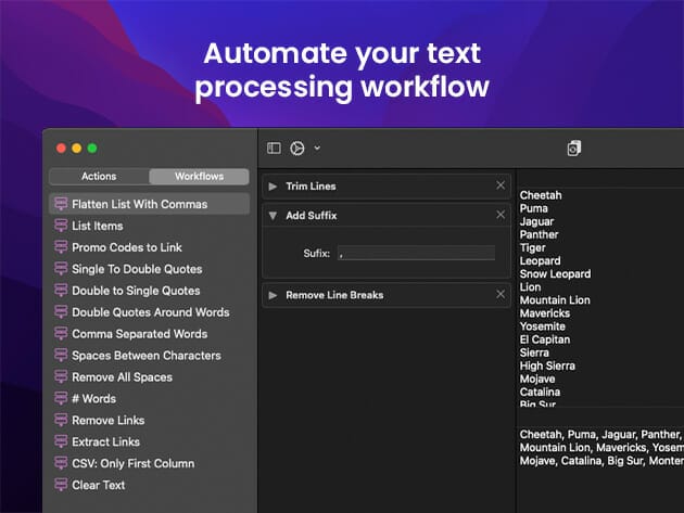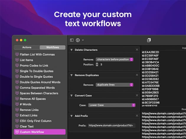 A powerful and easy-to-use tool that will help you transform your text. Text Workflow removes the need to perform repetitive tasks manually on your text. Combine transformation actions to create powerful automations for your text. Save your transformation workflows to use them any time want.